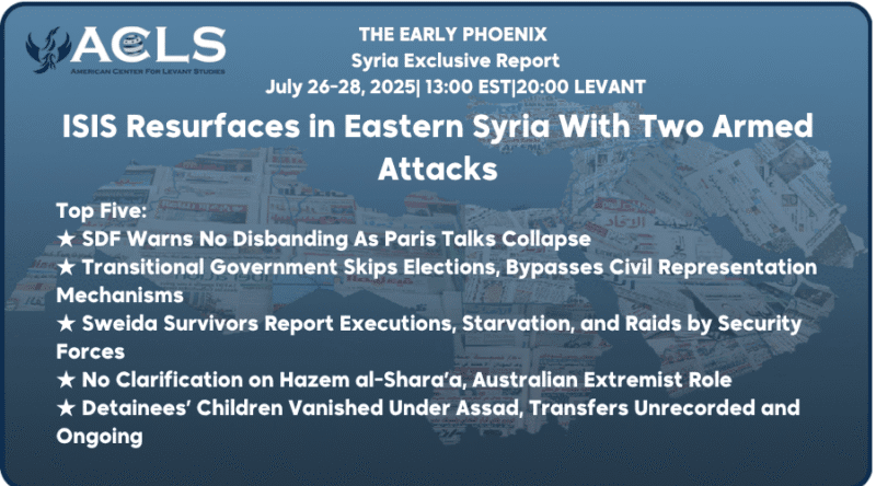 ★ Disclaimer: The Early Phoenix is a digest of various news sources compiled by the Early Phoenix team and edited by Rania Kisar. The items are curated, concise summaries of news items hyperlinked within each story. The items and summaries presented do not necessarily represent the views of the American Center for Levant Studies.