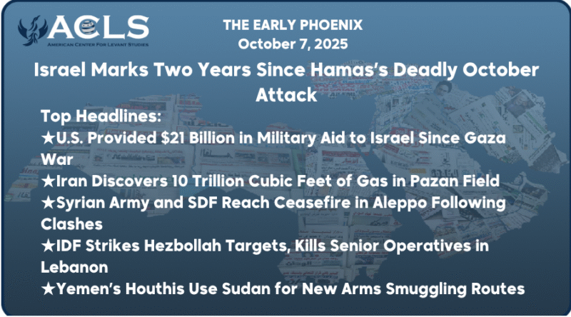 ★ Disclaimer: The Early Phoenix is a digest of various news sources compiled by the Early Phoenix team and edited by Rania Kisar. The items are curated, concise summaries of news items hyperlinked within each story. The items and summaries presented do not necessarily represent the views of the American Center for Levant Studies.