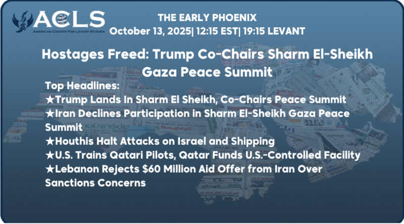 ★ Disclaimer: The Early Phoenix is a digest of various news sources compiled by the Early Phoenix team and edited by Rania Kisar. The items are curated, concise summaries of news items hyperlinked within each story. The items and summaries presented do not necessarily represent the views of the American Center for Levant Studies.