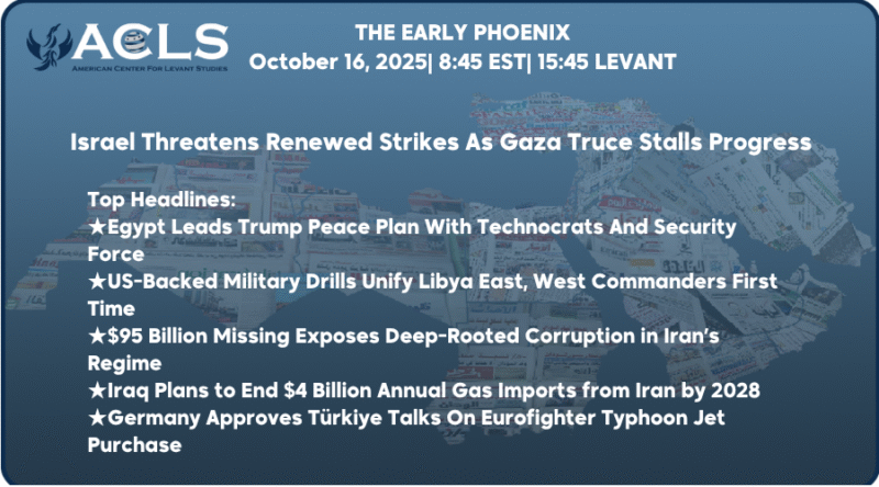★ Disclaimer: The Early Phoenix is a digest of various news sources compiled by the Early Phoenix team and edited by Rania Kisar. The items are curated, concise summaries of news items hyperlinked within each story. The items and summaries presented do not necessarily represent the views of the American Center for Levant Studies.