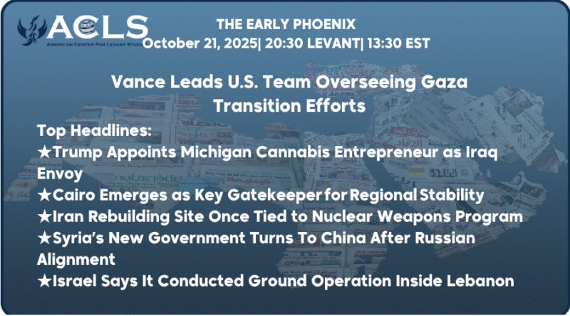 ★ Disclaimer: This publication is a digest of various news sources compiled by the Early Phoenix team and edited by Rania Kisar. The items are curated, concise summaries of news items hyperlinked within each story. The items and summaries presented do not necessarily represent the views of the American Center for Levant Studies.