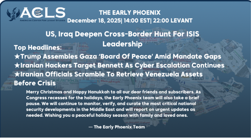 ★ Disclaimer: This publication is a digest of various news sources compiled by the Early Phoenix team and edited by Rania Kisar. The items are curated, concise summaries of news items hyperlinked within each story. The items and summaries presented do not necessarily represent the views of the American Center for Levant Studies.