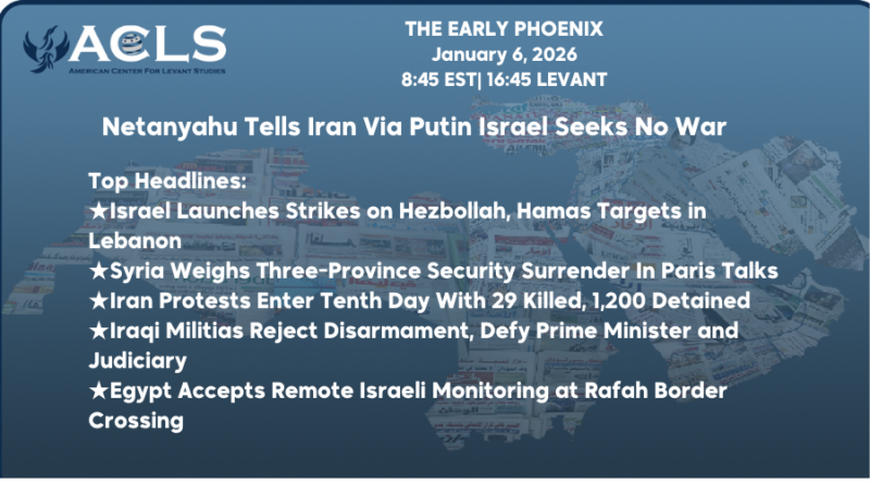 ★ Disclaimer: This publication is a digest of various news sources compiled by the Early Phoenix team and edited by Rania Kisar. The items are curated, concise summaries of news items hyperlinked within each story. The items and summaries presented do not necessarily represent the views of the American Center for Levant Studies.