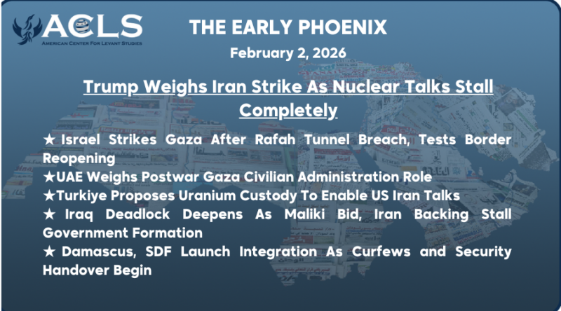 ★ Disclaimer: This publication is a digest of various news sources compiled by the Early Phoenix team and edited by Rania Kisar. The items are curated, concise summaries of news items hyperlinked within each story. The items and summaries presented do not necessarily represent the views of the American Center for Levant Studies.